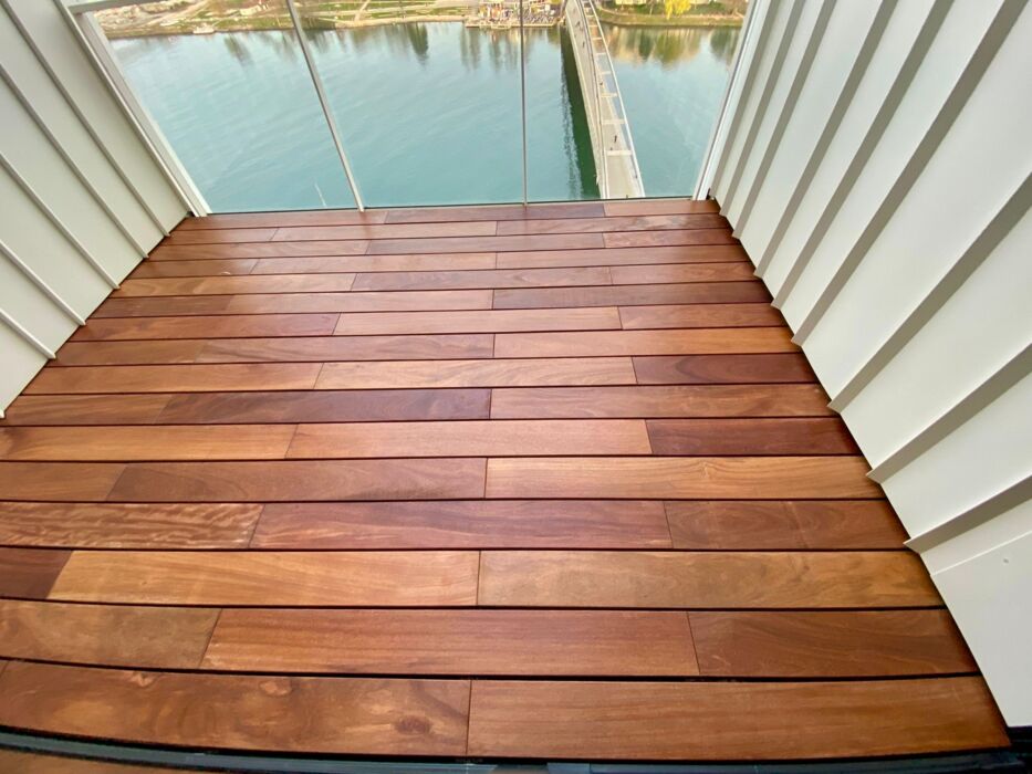"For our apartment on the banks of the river, we needed a deck that could withstand the intense sun and wind on the seventh floor. After consulting Hardwood Discount, we chose Ipé decking with the hidden clip system. The result is truly stunning; the invisible fixings give the balcony a modern, sleek hotel feel. Despite the exposure to the elements, the boards remain perfectly straight. We love enjoying the river views every day from our high-end hardwood deck.This is the result after applying the second coat of oil. PS: It's really handy that the boards aren't too long – they click together easily and fit into the lift without any trouble."