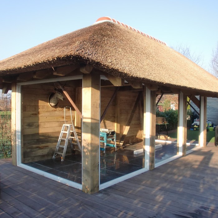 We have bought a roofing in oak, model Dennis 4.3 x 8 m1. We met this company a year ago, when we bought a hardwood Bankirai decking. We had an addition to get 2 extra uprights, which is super handled and realized. We are not finished yet, but the thatcher has been and it is starting to take shape. The handy construction drawing and the construction kit were easy to follow and to set up. We have been busy for 4 Saturdays with 3 people. We were glad that we were 3 strong men, because the beams are of great weight. We had the window frames and glass placed. We want to thank through this message Hardhout Discount for the beautiful roof. The decking was already installed a year ago from Ipe wood.